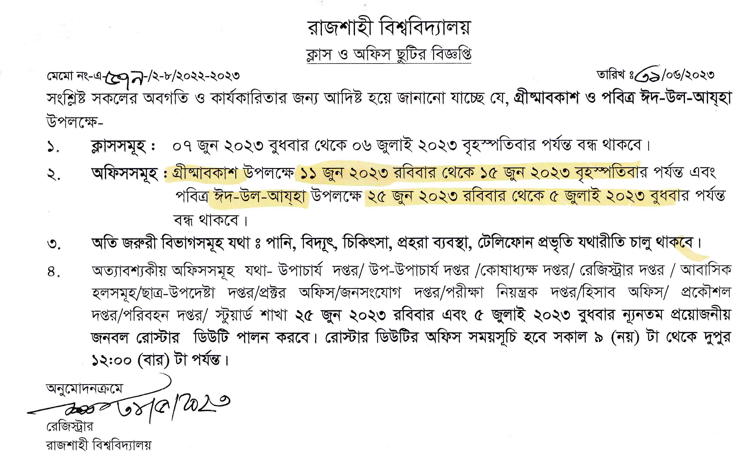 রাজশাহী বিশ্ববিদ্যালয় ক্লাস ও অফিস ছুটির বিজ্ঞপ্তি