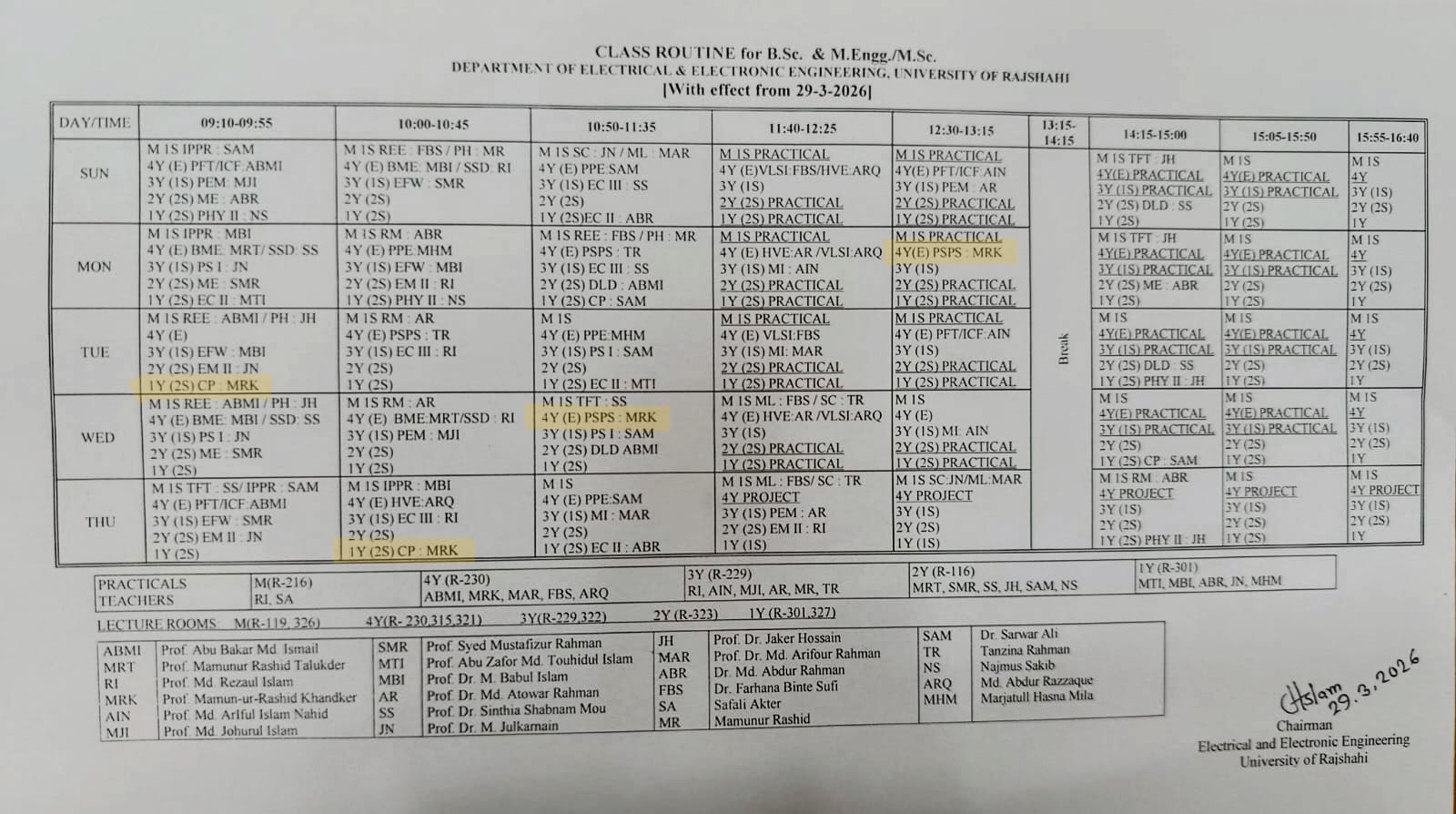 Class Schedule Effective from 29-03-2026