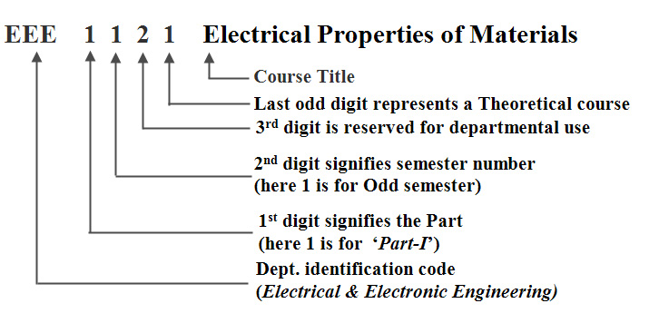 (a) The first digit will correspond to the Part (year) in which the course is normally taken by the students, (b) The second digit will correspond the semester (1 for odd and 2 for even) in which the course is normally taken by the students, (c) The third digit will be reserved for departmental use for such things as to identify different areas within a department, (d) The last digit will be odd for theoretical, even for laboratory courses and ‘0’ for Board Viva voce and (e) The course designation system is illustrated by the following example.