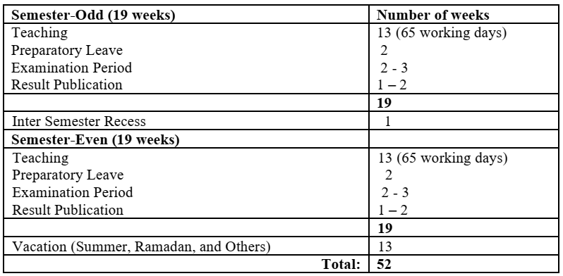 1. The B. Sc. Engg. programmes shall extend over a period of four academic years, each of a normal duration of one calendar year, divided into 2 Semesters; (details are given in Section 7 of the ordinance).