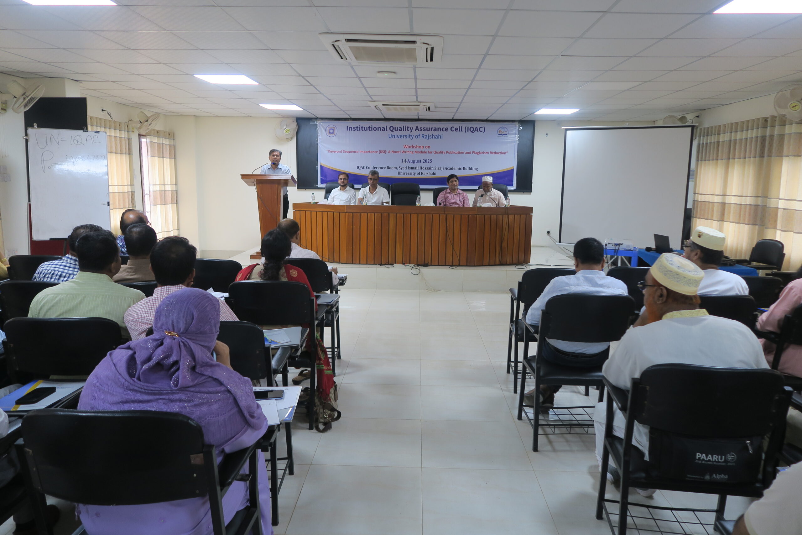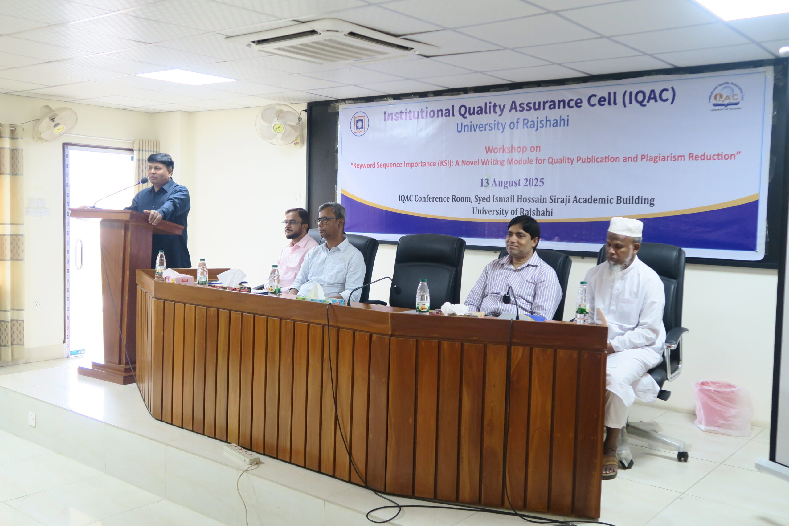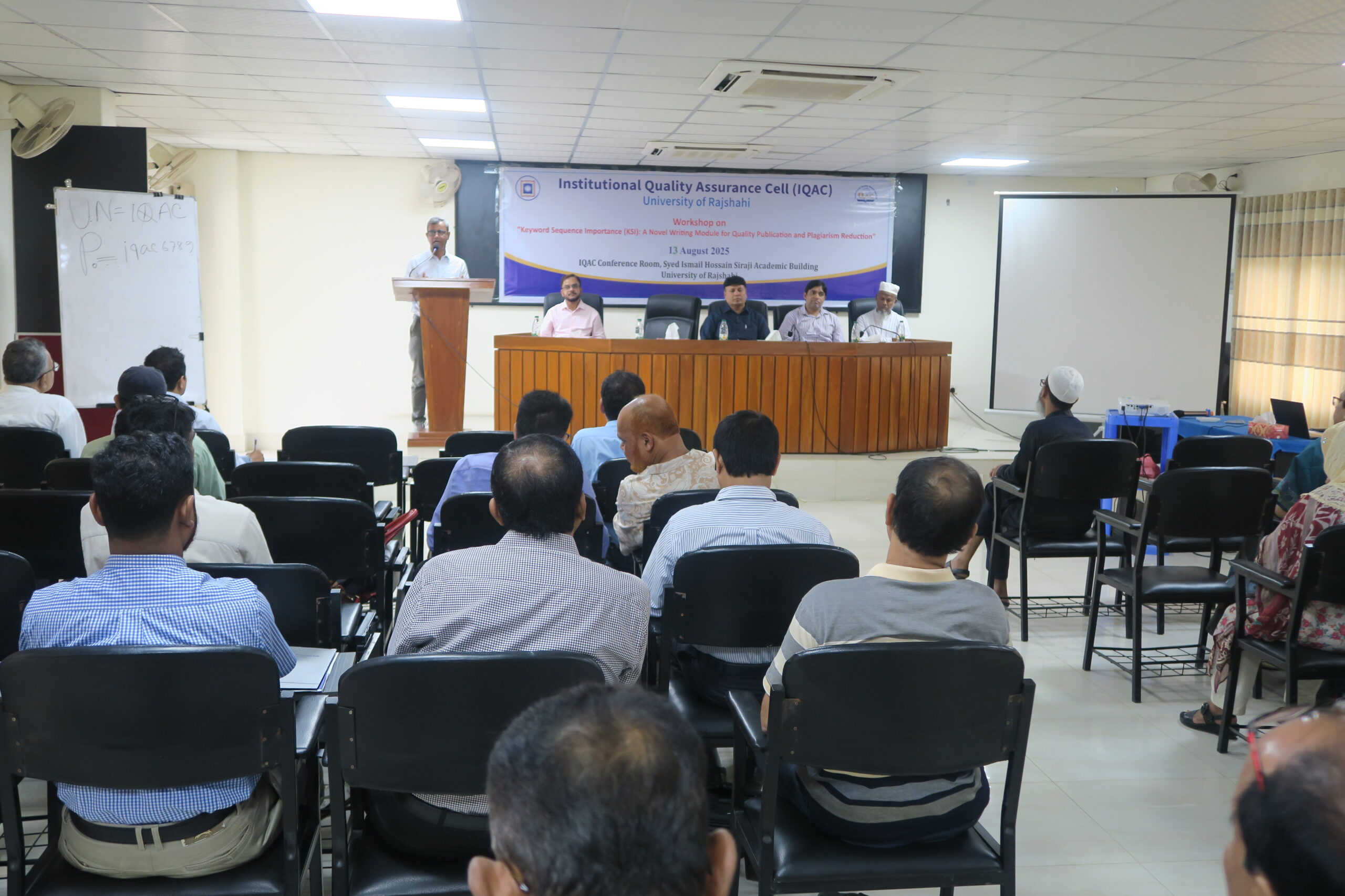 রাজশাহী বিশ্ববিদ্যালয় ইনস্টিটিউশনাল কোয়ালিটি অ্যাসুরেন্স সেল (আইকিউএসি) বিশ্ববিদ্যালয়ের শিক্ষার গুণগত মান উন্নয়নের লক্ষ্যে বিভিন্ন কার্যক্রম পরিচালনা করে আসছে। এরই ধারাবাহিকতায় শিক্ষক ও গবেষকদের থিসিস ও গবেষণাপত্র লেখার দক্ষতা বৃদ্ধির লক্ষ্যে আগামী ১২, ১৩ ও ১৪ আগস্ট ২০২৫ তারিখে Workshop on “Keyword Sequence Importance (KSI): A Novel Writing Module for Quality Publication and Plagiarism Reduction” শীর্ষক প্রশিক্ষণ কর্মশালার আয়োজন করেছে। ১২ আগস্ট ২০২৫ তারিখ দিনব্যাপী এ কর্মশালার উদ্বোধনী অনুষ্ঠানে প্রধান অতিথি হিসেবে উপস্থিত ছিলেন রাজশাহী বিশ্ববিদ্যালয়ের মাননীয় উপাচার্য প্রফেসর ড. সালেহ্ হাসান নকীব এবং ১৩ ও ১৪ আগস্ট ২০২৫ তারিখ যথাক্রমে মাননীয় উপ-উপাচার্য (প্রশাসন) প্রফেসর ড. মোহাম্মদ মাঈন উদ্দীন ও মাননীয় উপ-উপাচার্য (শিক্ষা) প্রফেসর ড. মোহা. ফরিদ উদ্দীন খান।