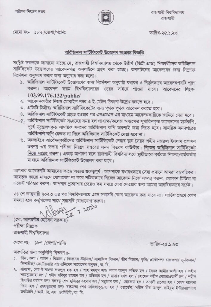 অরিজিনাল সার্টিফিকেট উত্তোলন সংক্রান্ত বিজ্ঞপ্তি।