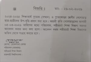 2024-2025 শিক্ষাবর্ষে স্নাতক(সম্মান) ও স্নাতকোত্তর শ্রেণীর খেলোয়াড় ছাত্রীদের উপ-বৃত্তি প্রদান প্রসঙ্গে।
