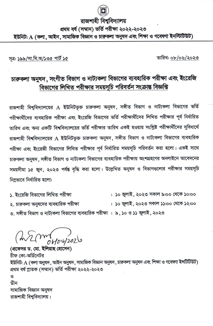 সংগীত বিভাগের ব্যবহারিক পরীক্ষার সময়সূচি পরিবর্তন