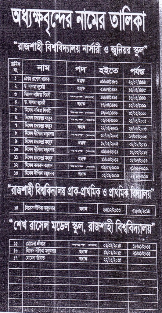 প্রয়োজনের পরিপ্রেক্ষিতে পর্যায়ক্রমে মিসেস সেকেন্দ্রা মাহবুব, মিসেস দীপিকা মজুমদার, মিসেস কামরুন রহমান, মিসেস শরীফা খাতুন, মিসেস মোমেনা জীনাত, মিসেস লায়লা আরজুমান্দ বানু, মিসেস সুমিতা মিত্র, মিসেস নূরুন নাহার খান, মিসেস মনোয়ারা রহমান ও মিসেস কামরুন্নেছা লেখা ১৯৯৯ সালের মধ্যে স্কুলে যোগদান করেন। ০৬-১২-১৯৯৭ সালে পরিচালনা পরিষদে সর্বসম্মতিক্রমে স্কুলটির নাম আংশিক সংযোজন করে রাজশাহী বিশ্ববিদ্যালয় নার্সারী ও জুুনিয়র স্কুল রাখা হয়। সময়ের ধারাবাহিকতায় স্কুলে শিক্ষার্থী ও শিক্ষক বৃদ্ধির সাথে সাথে বিশ্ববিদ্যালয় প্রশাসন ক্লাসরুম এবং আনুষঙ্গিক সকল দিকে সাহায্যের হাত বাড়িয়ে দিয়েছেন সকল সময়েই।
